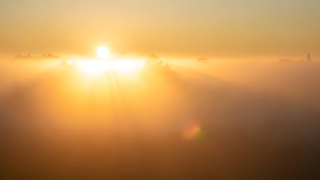 A breathtaking image capturing the moment when the sun rises above a thick layer of fog, casting a warm glow and rays of light through the misty atmosphere, symbolizing hope and a new beginning.