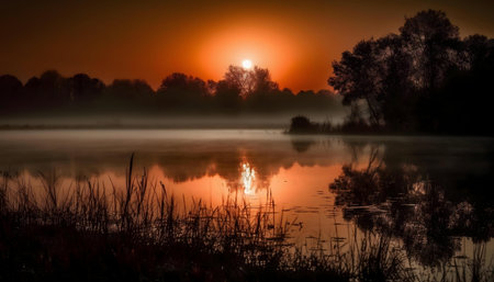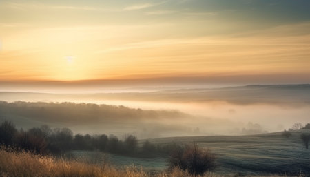 Tranquil sunset over rural landscape, foggy forest and meadow generated by artificial intelligence