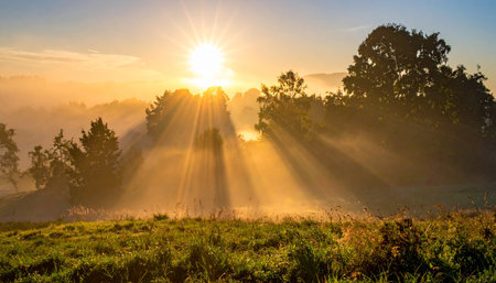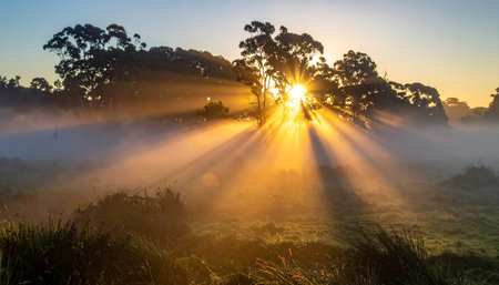 Serene sunrise scene with sunbeams piercing through mist over a calm rural setting