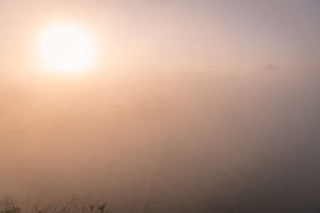 Sunrise over the misty valley in the morning. Beautiful landscape.