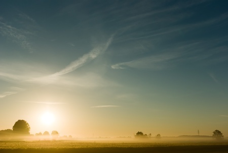 Beautiful sunrise over foggy meaodw. Tranquil landscape photographed on typical polish countryside. Grass and plants with dewdrops produce fog and haze under warm sunlight. Summer landscape. photographed with full frame camera and wide angle lens.