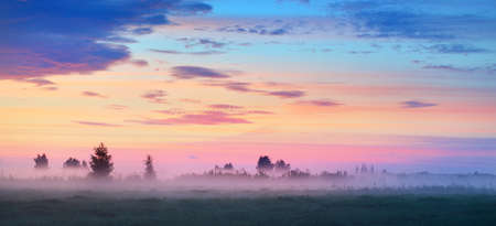 Colorful sunrise at the field with morning fog