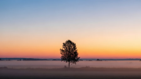 A tranquil foggy landscape at sunrise featuring a lone tree silhouetted against vibrant colors in the sky, creating a serene atmosphere ideal for reflection.