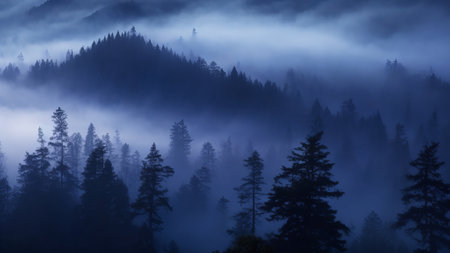 A captivating misty morning scene showcasing a dense evergreen forest enveloped in soft fog, creating an atmospheric and serene backdrop for nature lovers.
