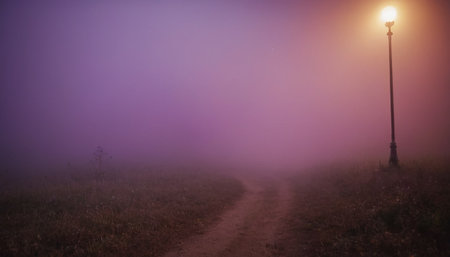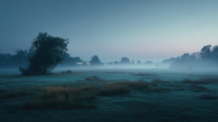 Fog envelops a serene field creating an enchanting atmosphere at dusk with muted colors.