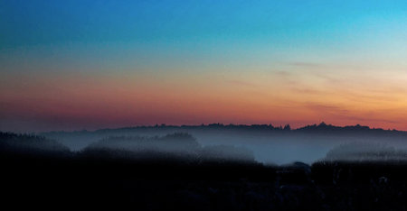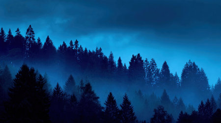 Mysterious foggy forest landscape at dawn or dusk. Pine trees silhouetted against a gradient sky, creating a tranquil, atmospheric nature scene.