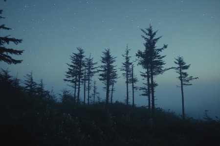 Stars twinkle bright in a clear night sky, casting a serene glow over tall trees. The silhouettes create a peaceful atmosphere in a secluded forest landscape.