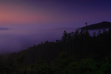 In the early morning soft pink and purple hues spread across a valley shrouded in mist. Trees emerge from the fog creating a serene and peaceful atmosphere before sunrise.