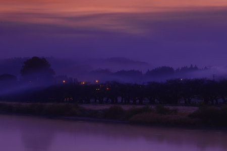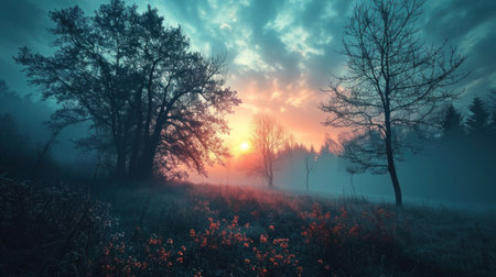 Natural showing dramatic sunset over a misty landscape with vibrant orange and purple sky and silhouetted trees...