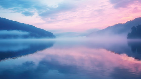A tranquil landscape featuring mist and fog at dawn, with soft pastel colors and serene scenery, creating a peaceful atmosphere for nature lovers.