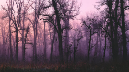 This image captures a misty forest landscape at dawn, featuring bare trees framed by soft purple hues. It evokes a tranquil and ethereal mood, perfect for nature themes.