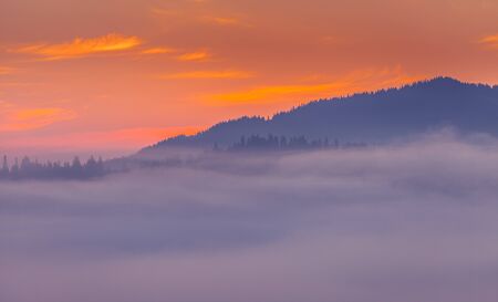 Foggy sunrise in the Carpathian mountains. Ukraine, Europe.