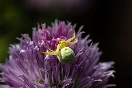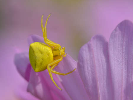 Little yellow Tomisidae Onostus spider walking and posing on a pink flower