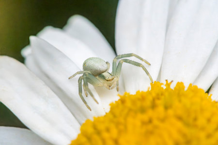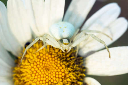White Flower crab spider Misumena vatia sits on daisy flower and waits for prey