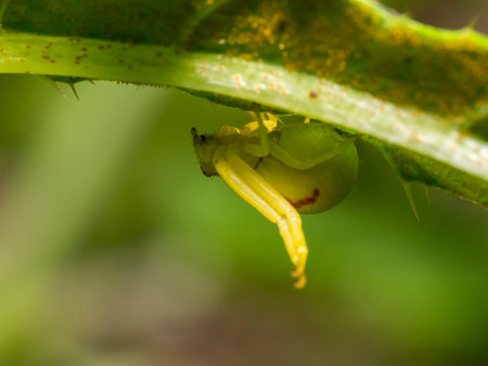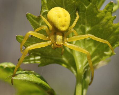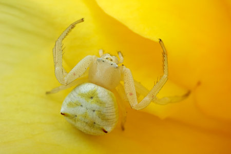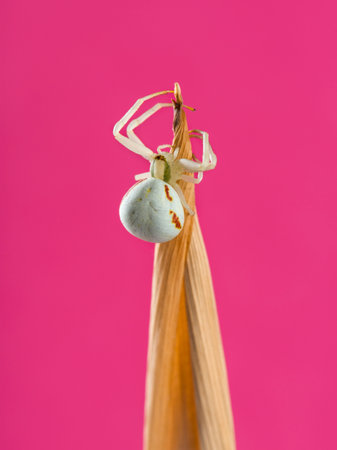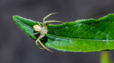 Macrophotography of a White Crab Spider (Misumena vatia). Extremely close-up and details.