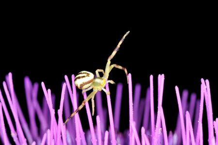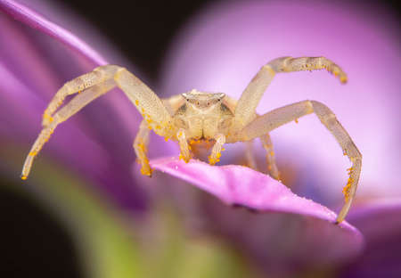 Close-up macro to a spider camouflaged over a lot of flowers similar to its colors
