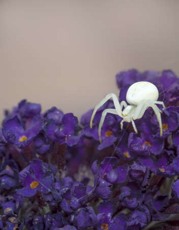 White Crab spider, Misumena vatia on deep purple flowers of Butterfly Bush ie Buddleia davidii.