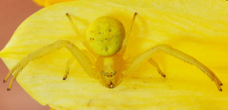 a yellow pumpkin spider camouflage itself on a yellow blooming flower