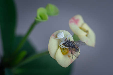 The white crab spider, Tomisus specbilis also known as the white flower spider is killing fly.