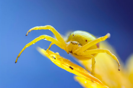 A stunning macro shot of a yellow spider perched on vibrant yellow flower petals. The image captures intricate details of both the spider and the blooming petals, highlighting the beauty of nature. Perfect for themes related to wildlife, gardening, and macro photography.