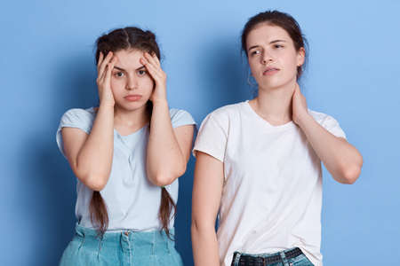 Thinking, tired or ill females with headache, young women touching her temples and neck, wearing white casual t shirts, standing isolated over blue background.