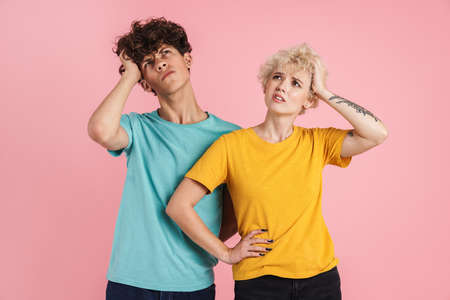 Portrait of a pensive teenage couple standing isolated over pink background