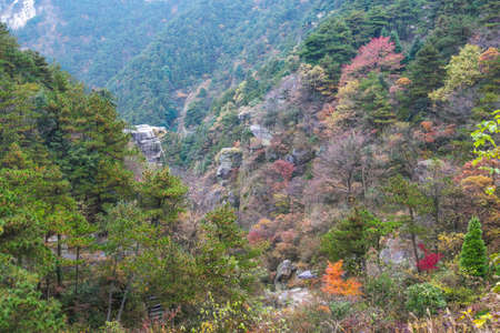 Autumn red leaves scenery in the light fog mountain of Nanjiang, Sichuan