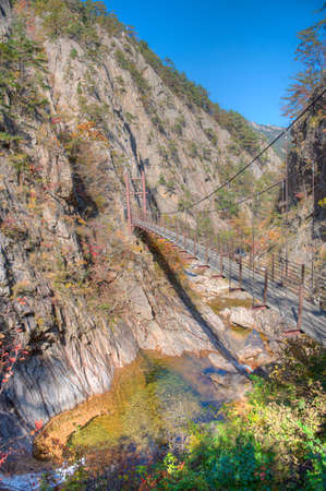 A ravine that reflects the suspension bridge and the surrounding scenery