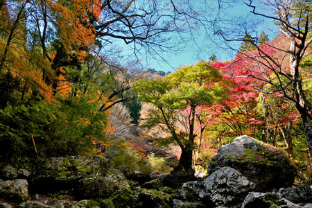 Mitake Shosenkyo Gorge Autumn foliage scenery view in sunny day. Beauty landscapes of magnificent fall colors. A popular tourist attractions in Kofu, Yamanashi Prefecture, Japan