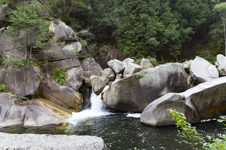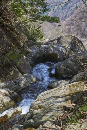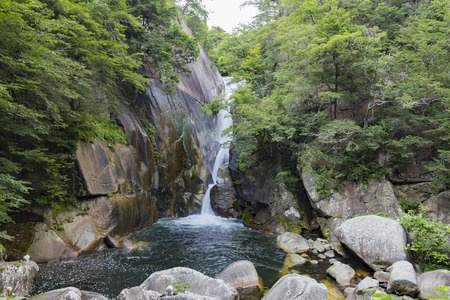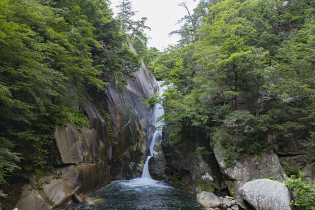 A waterfall flowing in the middle of rocky mountains in Sandankyo gorge, Japan