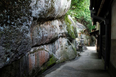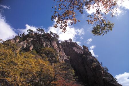 Kofu. Japan. autumn canyon. Rocks on a background of blue sky. Landscape of Japanese rocks. Kofu travel guide. Tour at Shosenkyo Gorge. Nature of the Mitake Shosen gorge. Cliffs of the Autumn Canyon