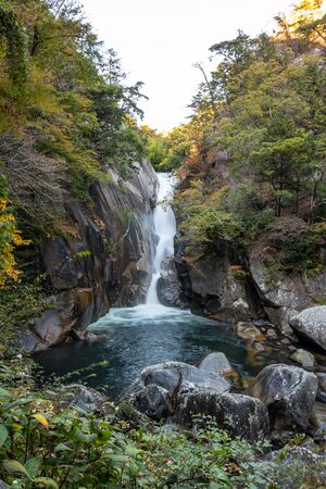 Senga Waterfall ( Sengataki ), A waterfall in Mitake Shosenkyo Gorge. Autumn foliage scenery view in sunny day. A popular tourist attractions in Kofu, Yamanashi Prefecture, Japan
