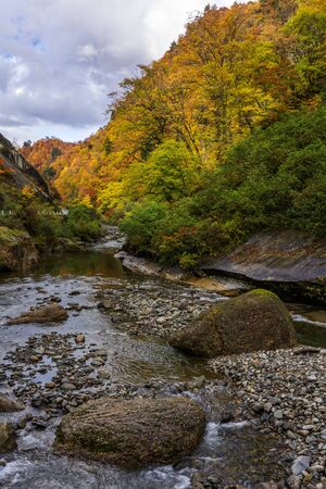 Beautiful landscape of colorful autumn forest and mountain river in Japan.