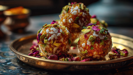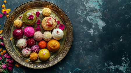 Delightful sweets presented on an ornate plate, adorned with colorful flower petals. Perfect blend of tradition and artistry for any festive occasion.