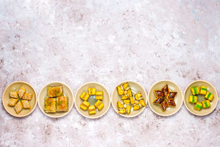 Variety of oriental sweets with pistachios, almonds and turkish delight