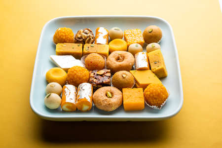 Stock photo of Indian sweets served in silver or wooden plate. variety of Peda, burfi, laddu in decorative plate, selective focus