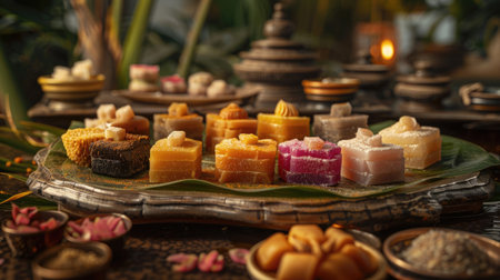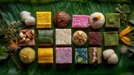 A vibrant assortment of traditional sweet treats beautifully arranged on a fresh leaf background, showcasing an appealing mix of colors and textures.