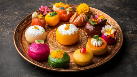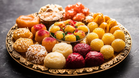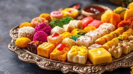 A stunning display of assorted colorful sweets and desserts arranged beautifully on an ornate plate, perfect for festive celebrations and special occasions.