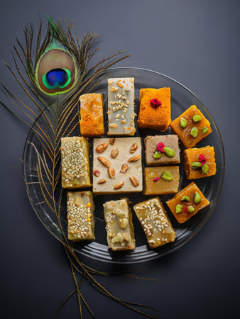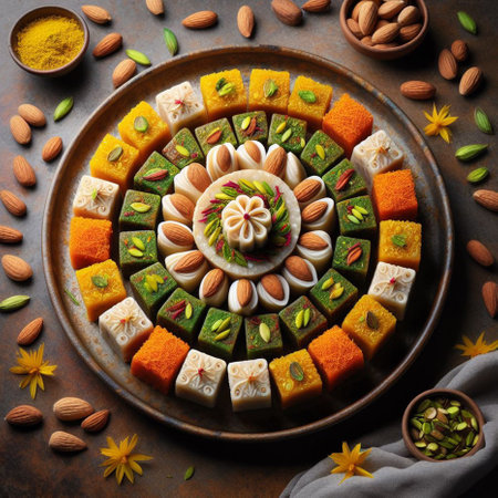 A vibrant assortment of traditional Indian sweets on a decorative plate, capturing the rich colors and textures that evoke a sense of sweetness and indulgence.