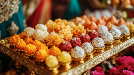 Traditional Indian sweetmeats like barfi and ladoo displayed on a golden tray during a festive occasion.