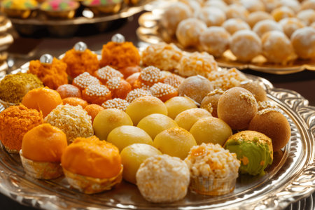 An array of Indian sweets, such as gulab jamun, jalebi, and barfi, beautifully arranged on a platter.