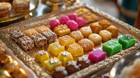 A beautifully arranged platter of traditional Middle Eastern sweets showcases a variety of colorful confections. The warm and inviting ambiance highlights the delightful textures and rich flavors, perfect for any celebration or gathering.