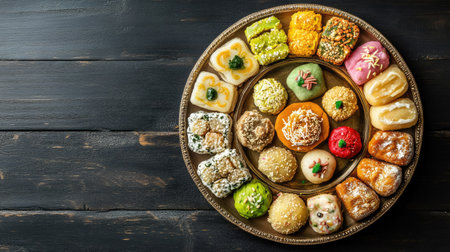 Assorted sweets on a decorative tray with copy space, ideal for Diwali or festive promotions.