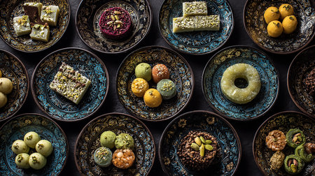 A beautiful arrangement of assorted traditional sweets on a decorative plate, showcasing a vibrant mix of colors and textures, perfect for festive occasions.