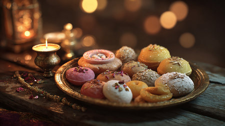 A beautifully arranged plate of assorted traditional sweets displayed elegantly with soft candlelight creating a warm and inviting atmosphere.