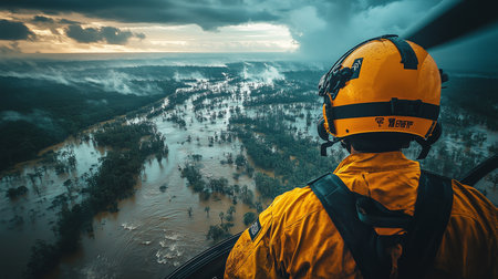 Aerial view of a rescue pilot in a helicopter overlooking a flooded landscape during stormy weather conditions, conveying a sense of urgency and response to a natural disaster.