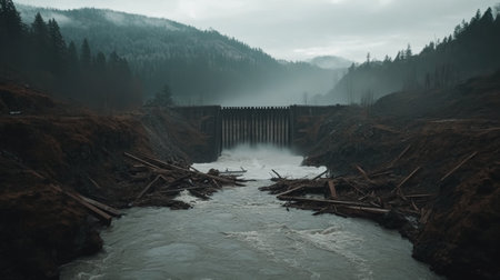 Misty Mountain River and Dam: Nature's Balance in Moody Weather.