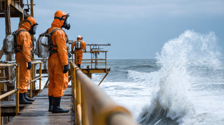 A team of workers in protective orange suits stands on an industrial platform, observing turbulent ocean waves during stormy weather, highlighting safety measures.