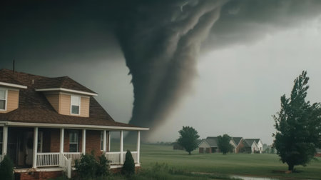 A powerful tornado forming in a rural landscape, with dark storm clouds and debris swirling around, near farmhouses