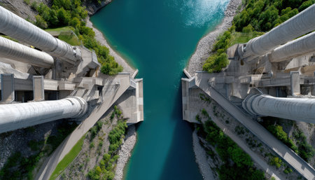 A hydroelectric dam generates power amidst a picturesque mountain landscape, showing the power of nature harnessed for sustainable energy.
